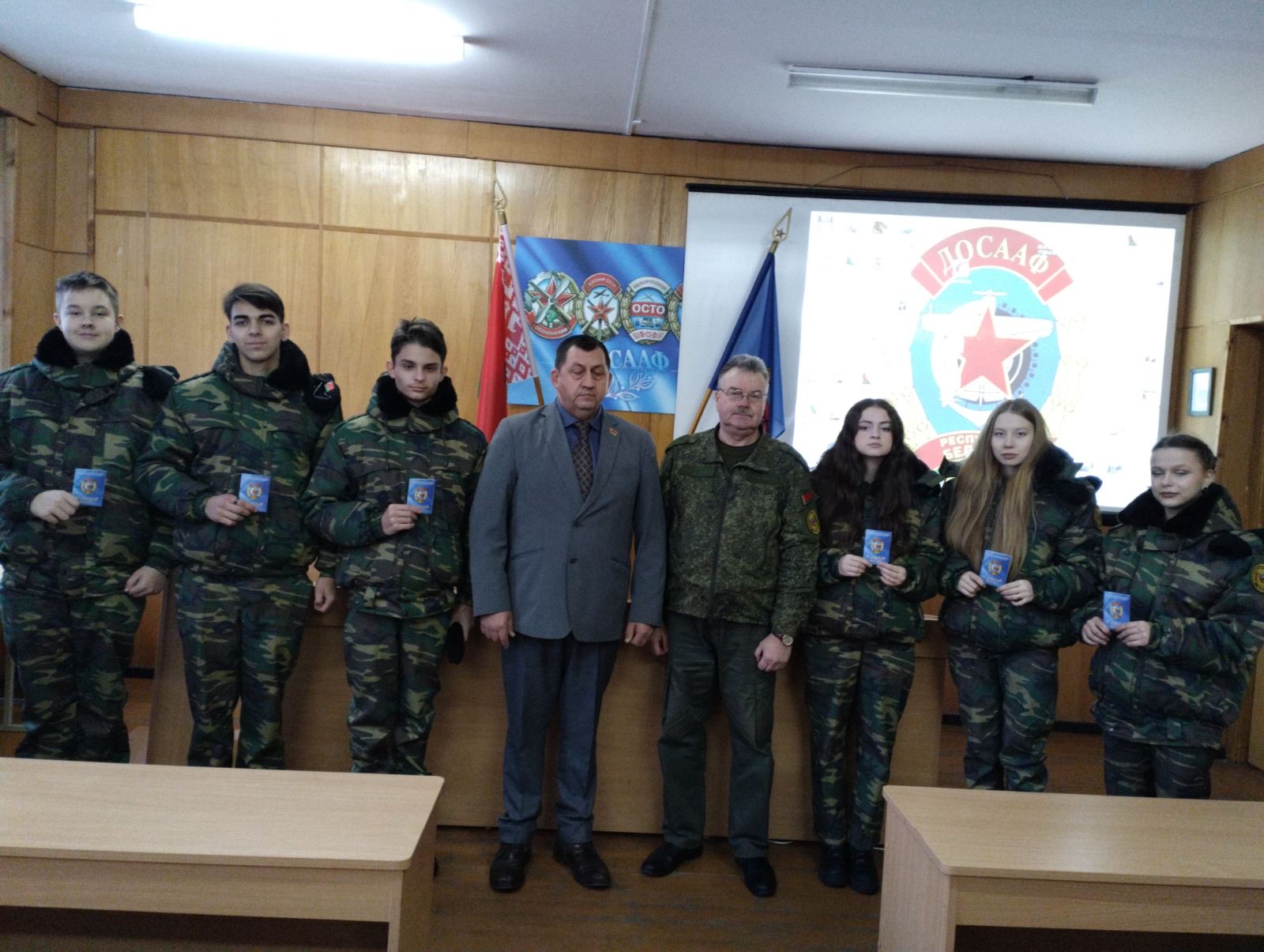 В конце встречи в торжественной обстановке были приняты в члены ДОСААФ новые участники военно-патриотического клуба, им были вручены членские билеты ДОСААФ.