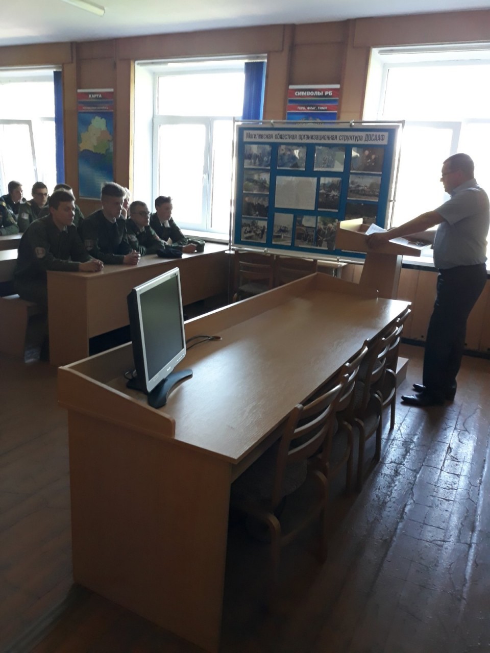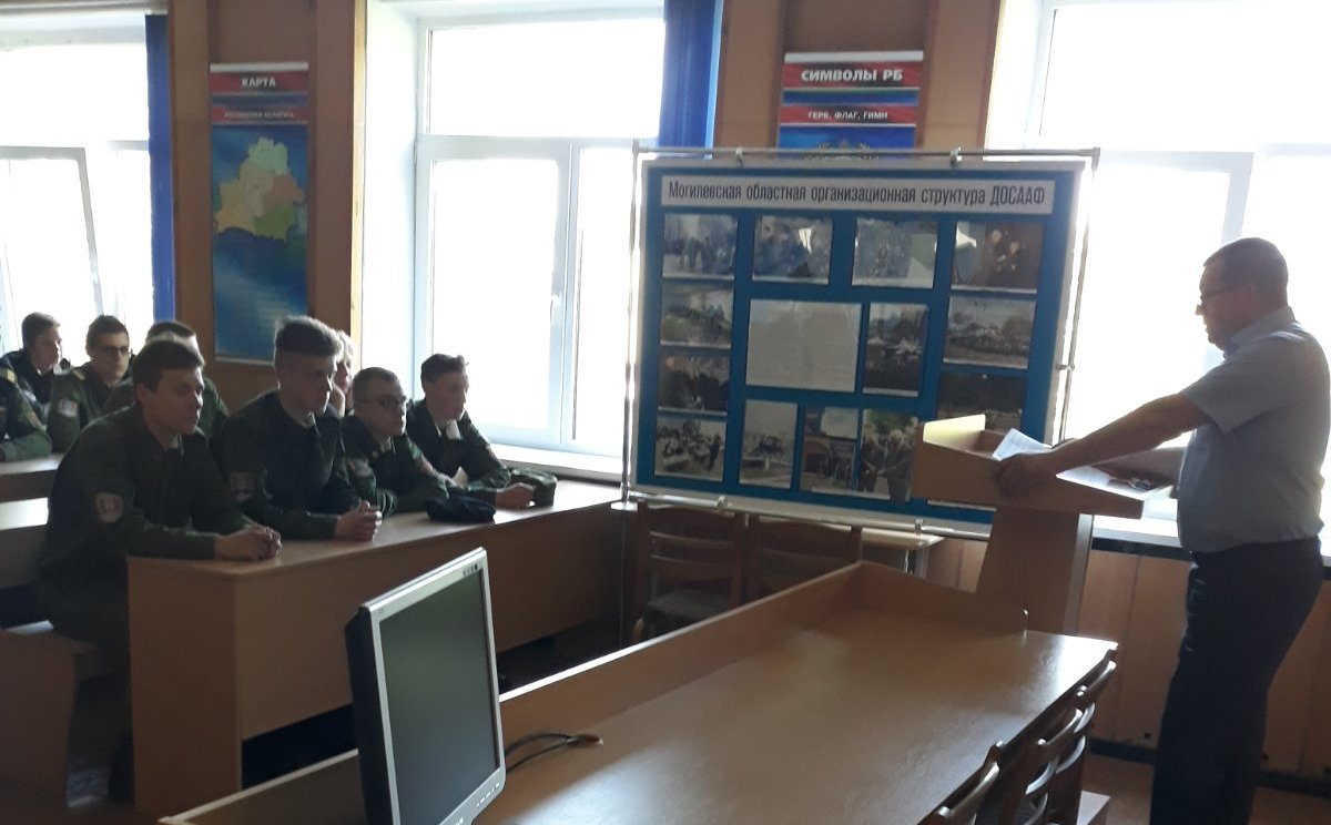 В актовом зале перед собравшимися выступил председатель Могилевский объединенной организационной структуры ДОСААФ Коньшин Александр Иванович. Он рассказал о целях и задачах оборонного общества. Были продемонстрированы фильм, рассказывающий об истории и современной деятельности легендарной организации и рекламные ролики.