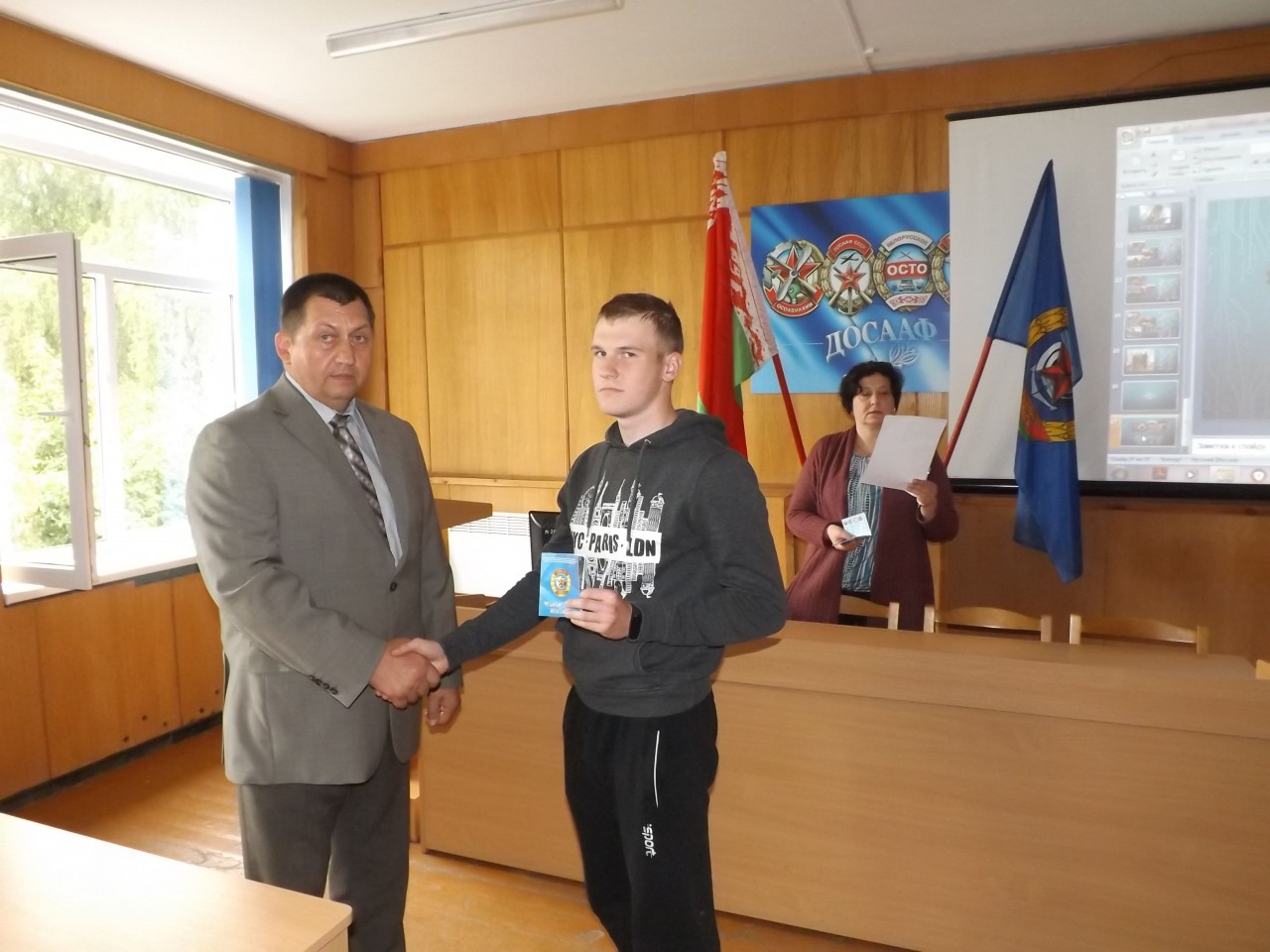 Перед учащимися выступил председатель Могилевской объединенной организационной структуры ДОСААФКоньшин Александр Иванович о роли оборонного общества в развитии чувства патриотизма, долга перед Родиной и перед своей семьей, воспитание нравственности, ответственности за свои поступки. В ходе выступления демонстрировался видеоклип «Марш ДОСААФ».